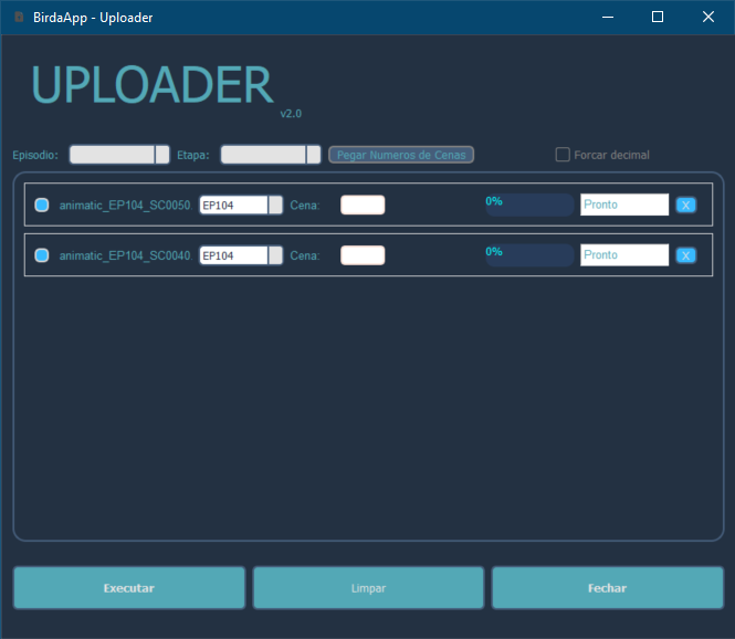 EpisodioDrop down que permite escolher o episódio para TODOS os arquivos na lista;EtapaDrop down que permite escolher a etapa da produção para TODOS os arquivos na lista;Pegar Número de CenasProcura o número das cenas em cada item, e preenche automaticamente o campoCenados mesmos;ExecutarBotão que executa o envio para o servidor do projeto;LimparBotão que limpa a lista de arquivos caso queira recomeçar;FecharFecha a aplicação;
